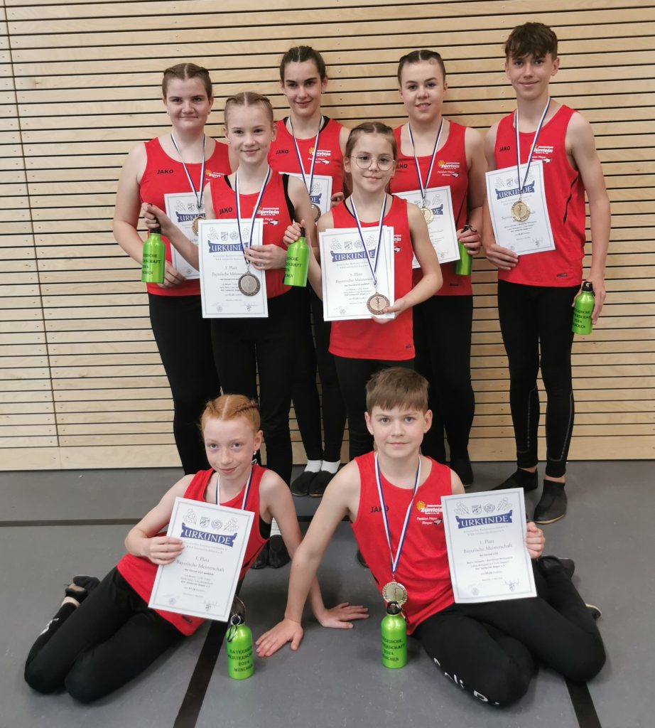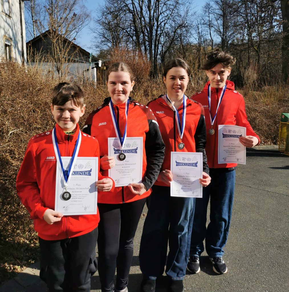 Am 16.03.2025 machte sich die Einradmannschaft mit Julia Deppert, Marie Hofmann, Lukas und Maximilian Wolujewicz auf den Weg nach Weißenbrunn zur bayerischen Meisterschaften im Einradfahren U19. Die vier zeigten ein sicheres und tolles sturzfreies Programm. Durch eine verbesserte Haltung konnte das Team seine Bestleistung deutlich erhöhen und wurde mit 70,02 Punkten bayerischer Vizemeister. Mit dieser Leistung hat sich die Mannschaft für das Halbfinale zur Deutschen Meisterschaft, dem Junior-Mannschafts-Cup, am 05.04.2025 qualifiziert. Wir drücken schon jetzt die Daumen dafür.