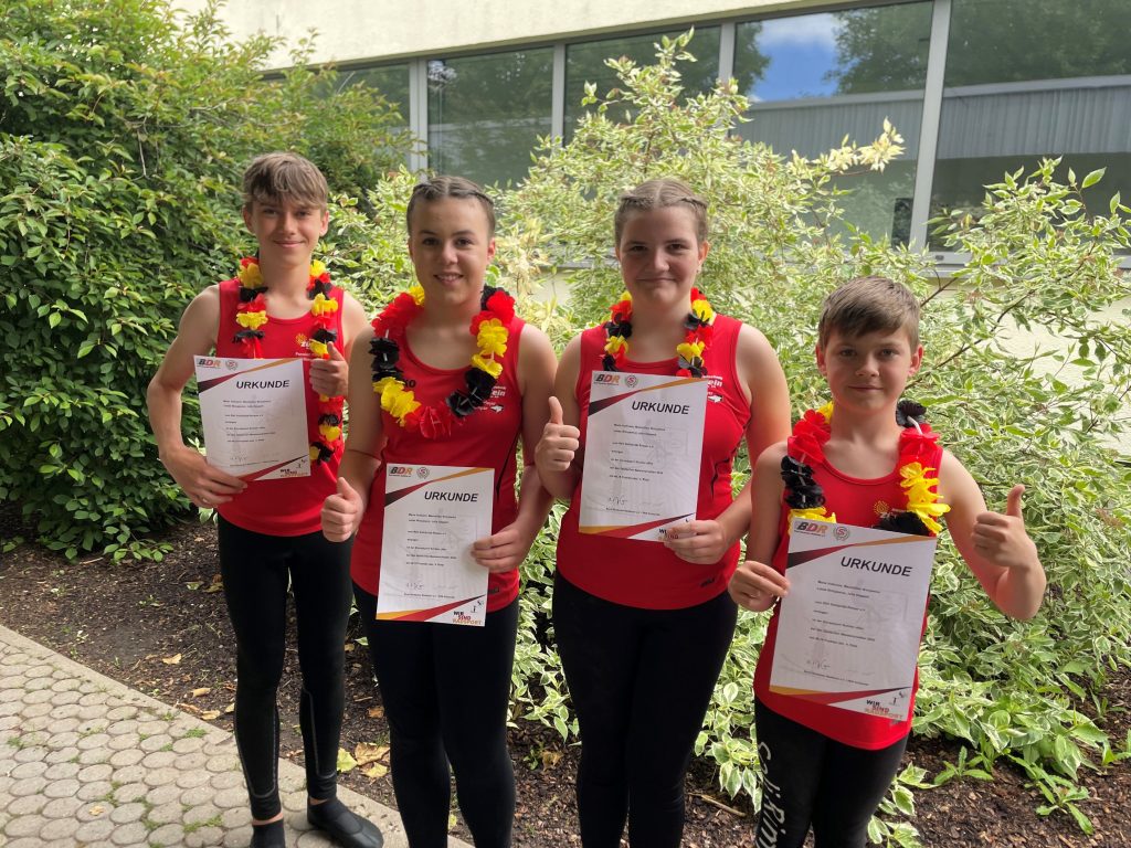 Für die 4er Einradmannschaft war es der letzte Start in der Schülerklasse. Für Marlen Wolujewicz, die kurzfristig für die verletzte Janina Laux eingesprungen ist, Annika Schuster, Bianca Gräsl und Laura Tischer war es das Ziel den Bundespokal mit nach Hause zu nehmen. Obwohl die Mühle mit den 4 Rechtsschleifen und der Torring nicht klappen wollten gab es im Rest des Programmes nur kleine Abzüge so dass die 4 Mädels bei der Siegerehrung den Siegerpokal in ihrer Altersklasse überreicht bekamen.