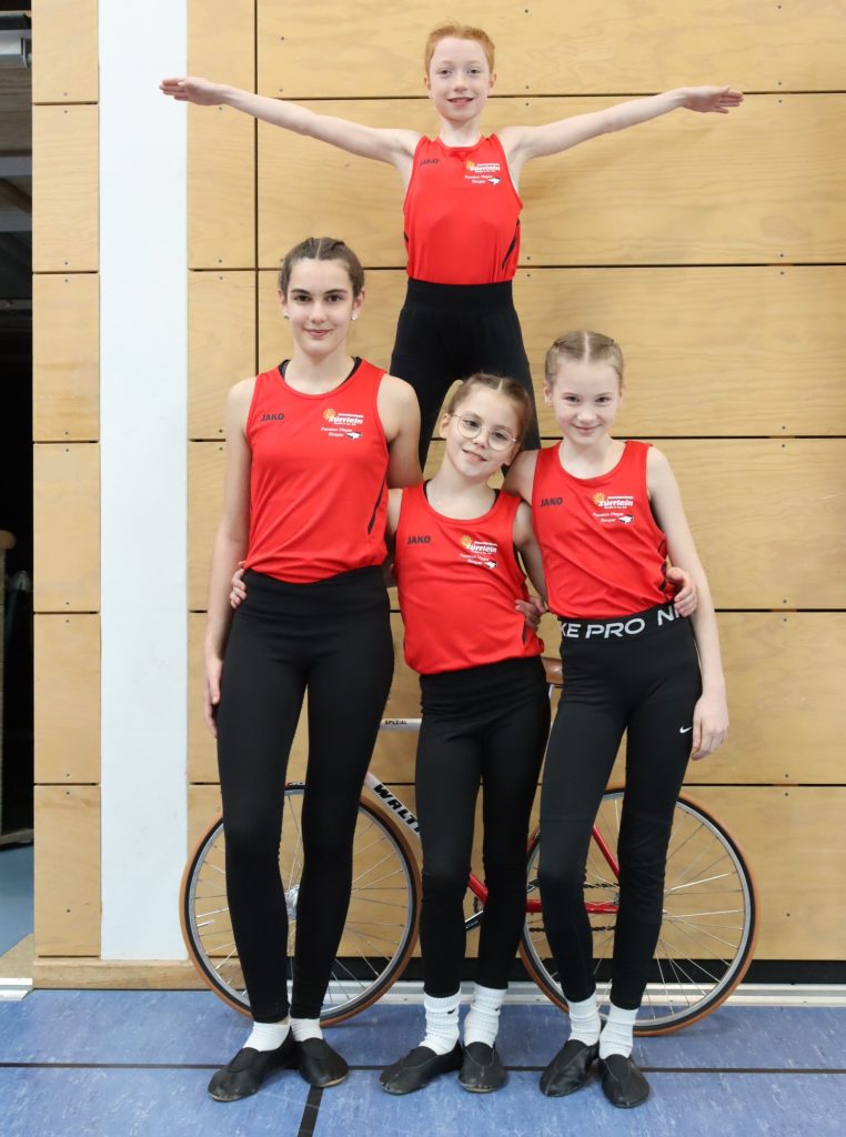 Ebenfalls qualifiziert war die 4er Einrad Mannschaft der Schülerinnen U15 mit Saskia Laux, Antonia Herbert, Christina Herbert und Lilly Wolujewicz. Sie präsentierten ebenfalls ein sauberes Programm und verpassten so nur knapp das Treppchen und wurden am Ende mit 54,34 Punkten Vierter.