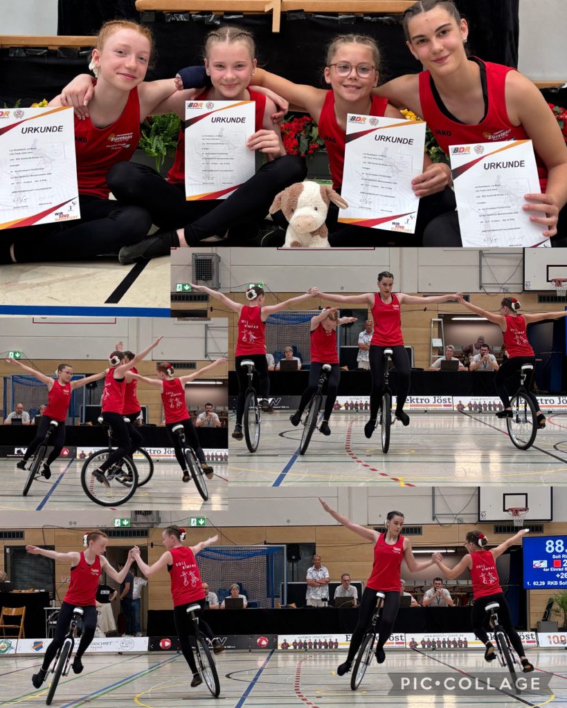 Der frühe Vogel fängt den Wurm. Am 15. Juni sind Lia Meyer, Lea Sendelbach, Carla Ganz und Lilly Traub ganz früh am Morgen nach Wiesbaden zu den Deutschen Schülermeisterschaften 2025 im Hallenradsport angereist. Gleich um 7:30 Uhr ging es das erste Mal aufs Einrad. Nach dem Einfahren und Kennenlernen des Bodens und der Fläche war es schon um 9:00 Uhr soweit, um als 6. Start des Tages vor die Kampfrichter zu treten. Ein paar wenige Unsicherheiten zwischendurch lies die vier Mädels nicht aus der Ruhe bringen und sie spulten ein hervorragendes Programm mit einer schönen Haltung wie aus dem Training ab. Mit 73,71 ausgefahrenen Punkten legten sie ein tolles Ergebnis vor, das zwei kommenden Konkurrenten in den Schatten stellte und so die Mannschaft bis auf den 8. Platz (von 14 Starts) nach vorne katapultierte. Herzlichen Glückwunsch für eine tolle DM-Premiere!