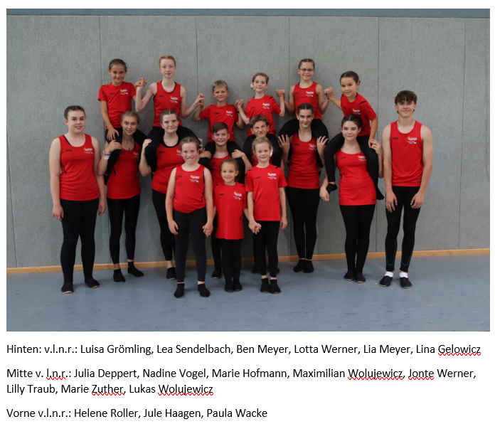 Kurz vor der wohlverdienten Mittagspause, musste sich unsere jüngste Einradmannschaft, bei der manche Sportler erst seit einigen Monaten Einrad fahren, nochmal konzentrieren. Antonia Herbert, Aileen Wiedmaier, Lilly Traub und Lukas Wolujewicz zeigten ein sauberes Programm trotz großer Nervosität. Kein Sturz, keine Übung vergessen und immer an die Mannschaft gedacht. So konnten die Trainer stolz sein. Letztendlich belegte die Gruppe den 1. Platz.